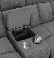 Create the perfect retreat from the world, prioritizing comfort with this transitional reclining loveseat. Charcoal upholstery is smooth and soft, creating a stylish addition to your living room or den. Between the recliners is a center storage console with a compartment for accessories and essentials and a pair of cupholders to keep beverages within reach. Supportive seating is paired with plush cushions, offering exceptional comfort and relaxation for movie marathons and catching up with the family. Pillowtop armrests are a lush finishing touch, adding inviting comfort when curling up or kicking back. Key Features: • Create the perfect retreat with this transitional reclining loveseat, featuring charcoal upholstery, supportive seating, plush cushions, and pillowtop armrests • Center storage console with a compartment for accessories and essentials and a pair of cupholders for beverages • Stylish addition to your living room or den, offering exceptional comfort and relaxation • Smooth and soft upholstery for a luxurious feel • Inviting comfort for movie marathons and catching up with the family