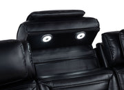 Designed for modern comfort and convenience, this dual power loveseat blends technology with bold styling. Power recline and adjustable power headrests offer personalized relaxation, while the center console features a lift-top compartment, two cup holders, and a built-in Bluetooth speaker for seamless audio. Finished in sleek black leatherette with dramatic LED under glow, it brings smart design to any contemporary lounge or home theater. Key Features: • Dual power loveseat in black faux leather with power recline and power headrest control • Center console includes lift-top storage, two cup holders, and built-in Bluetooth speaker • Both sides feature control panels with USB-A, USB-C ports, and one-touch home buttons • Sleek padded arms with cup holders add comfort and convenience to every seat • Blue LED under glow lighting enhances the base with a bold modern ambiance • Upholstered in smooth leatherette with deep channeling for comfort and visual depth