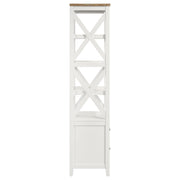 Spacious or compact, a casual living space has storage needs, and this wood media tower is a solid choice. Organize books and implements neatly while adding a fresh, inspiring look to a living room or family room. This modern tower is a mix of cottage-style, coastal, and rustic farmhouse, offering a superbly versatile fit. White finish wood construction features a four-shelf open bookcase above a two-drawer storage unit with full-drawer extension glides, as an eye-catching geometric look places X-shape elements on each side of its open bookcase. A brown finished ash veneer top changes up the style to add even more design flexibility. Key Features: • Organize books and implements neatly with a wood media tower • White finished wood construction with four-shelf open bookcase • Two-drawer storage unit with full-drawer extension glides • Eye-catching geometric look with X-shape elements on each side • Brown finished ash veneer top for added design flexibility