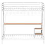 This workstation bunk bed offers streamlined function with a space-conscious footprint. The top full-size bunk includes mesh siding and full-length guardrails for elevated safety, while the lower twin bed offers a cozy sleep space or casual lounging zone. Built-in ladders on both ends provide flexible access, and the integrated full-length desk underneath the upper bunk creates a dedicated workspace. Engineered wood surfaces feature a wood-look laminate veneer for added warmth and durability. Key Features: • Full-over-twin bunk bed in matte black powder-coated metal with integrated modern design • Top full-size bunk includes mesh siding and full guardrails for safe elevated sleeping • Lower twin bed sits beneath a wide built-in desk ideal for study or creative tasks • Desk and step surfaces made from engineered wood with wood-look laminate veneer • Dual ladders on both ends offer easy access and flexible room placement • Crafted from sturdy metal and engineered wood for daily durability and support