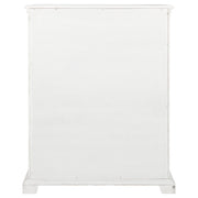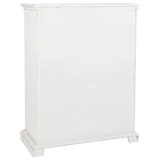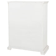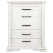 Timeless in spirit and refined in detail, this five-drawer chest evokes quiet charm and lasting beauty. A vintage white finish softens its stately frame, while molded edges and antique bronze ring pulls add character and depth. Designed with thoughtful craftsmanship, it offers spacious storage and smooth functionality. Built from poplar, engineered wood, and veneer, it brings elegance and purpose to the bedroom. Key Features: • Five-drawer chest with classic molding and clean lines for graceful bedroom storage • Vintage white finish offers a soft, aged look with traditional character • Antique bronze ring pulls add warmth and contrast to the light wood tone • Spacious drawers glide smoothly and are crafted with thoughtful construction • Top drawer is felt lined to protect delicate accessories and essentials • Built from poplar, engineered wood, and veneer for enduring style and strength