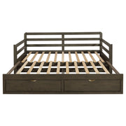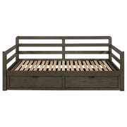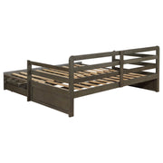 Bring function and fashion to your sleep space with this wood storage sleeper daybed. It is fashioned with pine, plywood, and MDF and is mattress-ready (no foundation required). Bed showcases storage footboard with two built-in drawers for linens and other items. You'll love the convenient fully slatted pull-out sleeper when guests stay over. It's perfect for any sleep space and is versatile enough for a tight living space like a loft, as well. Key Features: • Rustic twin XL daybed with trundle in grey finish • Trundle extends to accommodate second twin mattress (6” mattress recommended) • Trundle includes two (2) storage drawers • Pine, plywood, and MDF construction • Slat kits included