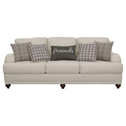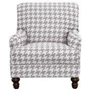 Chic and sophisticated, this impeccable three-piece living room sofa set is just the choice for a stylish, coordinated look. Offering a three-seat sofa, two-seat loveseat, and an armchair, the set is anchored with clean, classic lines including tailored English arms and attached back cushions. Gentle curves draw the eye while T-cushion seating ensures plush comfort and support. Each piece in the set rests on turned feet in an espresso finish. The sofa and loveseat feature light grey linen-like upholstery while the chair adds dimension and character with a charming grey houndstooth pattern.