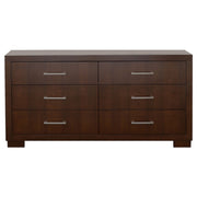 The Jessica wood bedroom set blends smart storage and sophisticated design for a refined modern retreat. Featuring a platform bed with a built-in bookcase headboard and integrated LED lighting, it offers both form and function. Each coordinating case piece is crafted from rubberwood, engineered wood, and ash veneer, complemented by silver-tone hardware for a contemporary touch. The rich cappuccino finish adds warmth, while English dovetail drawers with felt-lined tops provide practical, lasting elegance._x005F_x000D_ Key Features: • Queen bedroom set with LED-lit bookcase headboard and platform base • Includes matching dresser, mirror, and nightstand with bar hardware • Crafted from rubberwood, engineered wood, and ash veneer • Rich cappuccino finish warms up a contemporary bedroom • Felt-lined top drawers protect jewelry and delicate items • English dovetail drawer construction with smooth metal glides