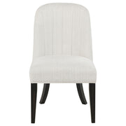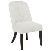 Gather in grounded elegance with this dining set, where sculptural form and graceful texture meet. A bold round pedestal table anchors the space in a burnished black finish, its open base and soft curves inviting conversation and connection. Surrounding it, barrel-back arm chairs cradle each guest in cream fabric and cushioned ease. From candlelit evenings to morning rituals, this set is a quiet celebration of balance, beauty, and belonging. Key Features: • Dining set features a burnished black pedestal table with curved edges and open base • Cream upholstered arm chairs offer barrel-back support and sculptural comfort • Soft flared frames and cushioned seats create an inviting, elevated dining experience • Round table silhouette encourages connection in intimate and open spaces alike • Crafted from rubberwood, ash veneer, engineered wood, and textured fabric • Modern organic styling blends strength, flow, and warmth in a unified setting