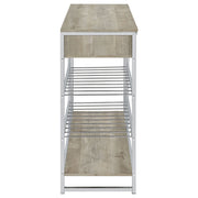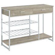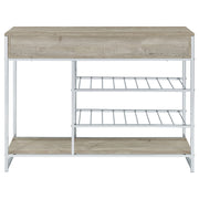 Your entertaining needs are filled with a sense of casual style and supreme organization as this wine cabinet provides space and configuration for a casual space. Make serving a breeze with a cabinet featuring gray finish wood products construction of an upper two-drawer cabinet and matching lower shelf. Minimalist metal framing adds a great optical benefit, with two slat shelves that accommodate dishware and stemware. Drawers open easily to make space for implements. This all-in-one bar cabinet offers a fresh, clean look and lots of convenience to organize an entertainment regimen. Key Features: • Gray finish wood products construction with minimalist metal framing for an all-in-one wine cabinet with two drawers and two slat shelves • Drawers open easily to make space for implements, while shelves accommodate dishware and stemware • Upper two-drawer cabinet and matching lower shelf provide space and configuration for a casual space • Fresh, clean look and lots of convenience to organize an entertainment regimen • Casual style and supreme organization for your entertaining needs