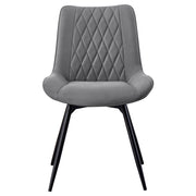 Return to a retro vibe in your casual dining space, adding this five-piece dining set to bring a soft, light feel. A round dining table anchors this tasteful set, featuring a gray faux marble top and a stylish geometric gunmetal finish iron base with hairpin-inspired legs. Side chairs are as comfy as can be with a gently angled seat back and foam-padded seat, all upholstered with soft gray fabric and dressed up with quilting detail. Swivel mechanisms add convenience to each chair, and retro-like round, tapered legs ups the ante on attitude. Set includes one dining table and four side chairs.
