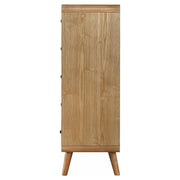Stylishly organize your wardrobe with this mid-century modern chest of drawers, built with pine, engineered wood, and walnut veneer for durability and style. Featuring five spacious drawers, it offers ample storage for clothing and accessories. Rounded edges and tapered legs lend retro flair, while felt-lined top drawers add a touch of functionality. Smooth drawer glides and subtle metallic hardware complete this elegant storage piece.