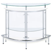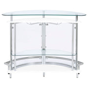 Upgrade your home entertainment options with this gorgeous, contemporary bar unit. With a convenient wine glass rack and ample storage space, it easily accommodates a wide variety of stemware, bar accessories, and cocktail ingredients. Graceful and glamorous, its curved silhouette is beautifully accentuated with gleaming chrome accents. A large, tempered glass top gives you plenty of prep space to mix delicious drinks for your guests. Complete with clear acrylic panels, this stylish unit allows you to show off your collection of fine wines and spirits in style. Key Features: • Freestanding home bar with curved frame and contemporary white finish • Clear tempered glass top and shelf offer strength and a polished presentation • Chrome-finished metal support adds brightness and visual balance • Integrated stemware rack and open shelving for barware and bottles • Clear acrylic panels create a sleek enclosure while keeping items visible • Built with acrylic, tempered glass, engineered wood, and chrome-plated steel