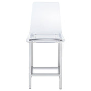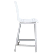 Elevate your space with this chic acrylic chair, designed to bring a modern and airy feel to any setting. The transparent seat offers a unique, minimalist look that blends seamlessly with various decor styles, while providing a comfortable perch for casual seating. Supported by a sleek chrome base, this stool includes a convenient footrest and adjustable height feature to ensure the perfect fit. Its durable acrylic construction is easy to clean, making it as practical as it is stylish. Ideal for contemporary kitchens or home bars, this stool adds a touch of sophistication without overwhelming the room. Key Features: • Modern acrylic counter height chair perfect for elevating wet bar or recreation room aesthetics • Futuristic design highlighted by a brilliant chrome finish for radiant elegance • Features sturdy back and foot supports for enhanced comfort • Perfect for home bars, kitchen islands, or casual dining areas • Constructed from high-quality acrylic, ensuring both durability and style
