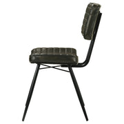 Blending industrial edge with vintage charm, this dining side chair is a striking addition to any dining space. Upholstered in hand-dyed genuine goat leather, the padded seat and backrest offer both comfort and durability. Vertical tufting details enhance texture and create a refined look, while the flared and tapered metal legs in a deep black finish provide sturdy support with a sleek contrast. Designed for long-lasting appeal, this chair brings a sophisticated yet rugged aesthetic to modern, industrial, or rustic interiors. Key Features: • Dining side chair with hand-dyed antique camel genuine goat leather upholstery • Padded seat and backrest provide comfort with a supportive, contoured feel • Vertical tufting details enhance texture and vintage-inspired charm • Flared and tapered metal legs in a deep black finish offer sturdy support • Strong metal frame ensures lasting durability for everyday dining use • A stylish addition to industrial, rustic, and modern dining spaces