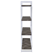 Enhance your storage and display space with this contemporary bookshelf, featuring a rustic grey herringbone finish for a modern organic touch. The sleek chrome metal frame provides durability and style, complemented by an X-shaped back support for stability. Four open shelves extend beyond the frame, creating a bold, geometric aesthetic perfect for showcasing books, décor, or collectibles. Crafted from engineered wood and metal, this shelving unit blends industrial and modern styles seamlessly, making it a stunning addition to living rooms, offices, or bedrooms. Key Features: • Four-tier bookshelf with a bold open-shelf design for a modern look • Rustic grey herringbone finish adds warmth and organic charm • Sleek chrome metal frame with X-back support enhances durability • Extended open shelves provide ample display space for books and décor • Crafted from engineered wood, MDF, and metal for long-lasting use • Ideal for home offices, living rooms, or contemporary spaces