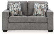 You’re in for a neat treat with this loveseat. Its comfy seats are covered in soft, textural upholstery, and the wide track arms are eager to support your quest for total relaxation. Distressed abstract toss pillows bring a fresh breath of contemporary style while accentuating the loveseat's color.