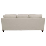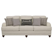 Farmhouse inspiration delivers a fresh, stylish look to a transitional space with this exceptional sofa. With tailored English arms and turned legs offering a contrasting espresso finish, this sofa shines with a light grey linen-like upholstered cover. Three reversible cushions with T-cushions on each end create comfort and stay in shape, as a solid wood frame with a sinuous spring deck sets the stage for durability. Attached back cushions remain stationary to prevent shifting. Enjoy the designer look of five accent pillows with varying blue print covers. Key Features: • Bring LOVE to your living area with this sophisticated farmhouse collection • Tailored English arms • Turned legs in espresso • No rearranging required with easy to maintain attached back cushions • Extend the life of your upholstery set with reversible seat cushions