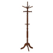 This charming coat rack offers a one-stop spot for stashing outerwear and accessories. Prevent clutter with a single venue for hanging coats, scarves, and hats. A cool tobacco finish over rubberwood construction adds a bold touch. Ornate design upgrades create a stylish motif. Place this coat rack in an entryway or doorway accommodating heavy traffic. Key Features: • Freestanding coat rack with three tiers of hooks for multi-level storage • Top section rotates smoothly to prevent item overlap or twisting • Turned post and rounded pegs add traditional visual detail • Solid rubberwood construction enhances strength and resilience • Tripod base provides balance and support on various flooring types • Finished in a deep tobacco tone for rich, timeless character