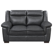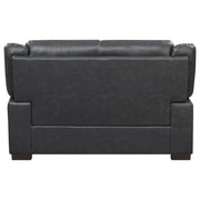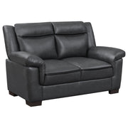 Bring modern sophistication to your living space with this contemporary loveseat, designed for comfort and everyday durability. Upholstered in smooth grey leatherette with subtle stitched detailing, it offers a polished yet inviting look. Padded cushions and pillow-top arms create a relaxing seating experience, while a high pillow back provides excellent support. Supported by dark brown block-style legs and a sturdy wooden frame, this loveseat is both stylish and reliable, making it a versatile addition to small spaces or larger living rooms._x005F_x000D_ Key Features: • Loveseat upholstered in smooth grey leatherette with subtle stitched accents for modern style • Plush padded seating and pillow-top arms offer long-lasting comfort and everyday relaxation • High pillow back design provides supportive seating, ideal for lounging or casual entertaining • Dark brown block-style legs add a grounded finish and enhance the loveseat’s sleek silhouette • Durable wooden frame construction ensures reliable stability and everyday lasting performance • Compact size makes this loveseat a versatile choice for small apartments or spacious homes