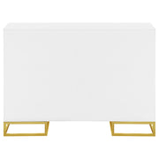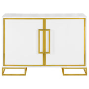 Add a bold statement piece to your space with this stunning modern accent cabinet. Featuring a glossy white finish with lustrous gold stainless steel trim, it showcases Art Deco flair with clean lines and geometric base supports. Behind double doors, adjustable shelves offer customizable storage. Crafted from durable MDF and stainless steel, this cabinet blends glamour and function beautifully in any setting. Key Features: • Sleek accent cabinet with bright white finish and glamorous gold trim • Art Deco-inspired stainless steel base adds bold architectural appeal • Double cabinet doors reveal adjustable shelves for versatile storage • Statement hardware and framed door panels enhance modern elegance • Made from wood, MDF, and stainless steel for durability and shine • Ideal for entryways, dining areas, or living rooms needing a luxe touch