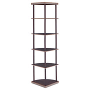 Classy and compact, this four-tier bookcase is a convenient option for a small space. It's designed to fit easily into a corner for space-saving convenience. Made from rubberwood and other high-quality materials, it provides a safe, sturdy spot to display books and keepsakes. A warm, rich cappuccino finish adds elegance and depth. Whether placed in a bedroom, den, or office, this bookcase is sure to enhance any room. Key Features: • Five-tier corner shelf with curved shelves and rich cappuccino finish • Rubberwood and engineered wood construction ensures structural strength • Compact triangular base ideal for small living rooms or bedrooms • Open frame design provides visual lightness and accessibility • Perfect for display in corners with limited wall space • Includes tip-over restraint to ensure safe, stable placement