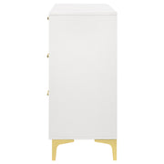 Maintain a cheerful and luxe bedroom with this splendid modern glam dresser. A perfect statement piece for contemporary bedrooms, this six-drawer dresser presents a light and airy expression. Accented with gold finished drawer pulls and bracket style legs, a luxe vibe shines through. The crisp, white finish maintains a sleek, dignified presence as well. Long and narrow, this dresser makes a lovely addition to your bedroom's focal wall and grounds a vanity dressing area. Key Features: • Perfect for contemporary and modern bedrooms • Six deep drawers offer all the space you need for garments and accessories • The bright, white finished frame ensures a light and airy disposition • Gold finished pull handles create a luxe flair • Gold bracket style legs carry through the warm metallic accents
