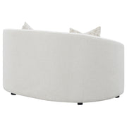 Gracefully contoured and inviting, this boucle loveseat brings soft sophistication to any space. The curved silhouette and sloped armrests offer a modern nod to mid-century design, while the latte boucle fabric provides tactile warmth and texture. Plush seat cushions ensure lasting comfort, complemented by accent pillows filled with premium faux down for a touch of luxury. Supported by discreet black legs, this loveseat balances elegance and coziness, creating a perfect retreat for contemporary living rooms._x005F_x000D_ Key Features: • Curved loveseat wrapped in soft latte boucle upholstery for texture • Sloped armrests and rounded edges highlight graceful contours • Two plush seat cushions deliver superior comfort and support • Tight back design maintains a smooth, tailored modern appearance • Accent pillows with faux down fill enhance softness and appeal • Perfect for compact living areas seeking warmth and sophistication