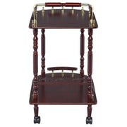 This classy serving cart will look at home in either your formal dining room or rec room. It features a handle pushing and top roomy top shelf for a cheese plate and two snifters of cognac. Bottom shelf includes a bottle holder for three bottles of your favorite Bordeaux and/or single malt. Elegantly crafted with merlot finish and brash-finish metal accents. Gives your room a traditional countryside appeal. Key Features: • Two-tier bar cart with guardrails for secure item transport and display • Merlot wood tone paired with brass-finish accents for a classic look • Integrated three-bottle wine rack keeps favorite bottles securely stored • Swiveling casters allow easy movement between rooms and spaces • Turned legs and raised gallery rails add vintage-inspired detailing • Crafted from rubberwood, engineered wood, paper laminate, and metal
